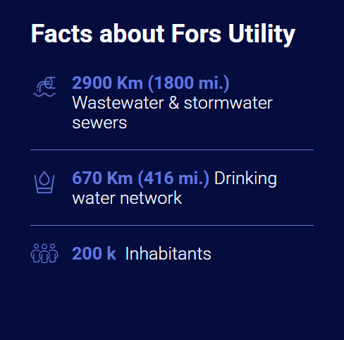 In 2021, Fors Utility adopted a ‘Wastewater Vision’ to ensure smart management of wastewater resources and infrastructure now and in the future. The new strategy focuses on digitization of both internal processes and customer-driven solutions – with asset management being one of the keystones in the overall digital transformation of the company. The strategy is partly about future-proofing the wastewater system of total 2900 Km (1800 mi.).