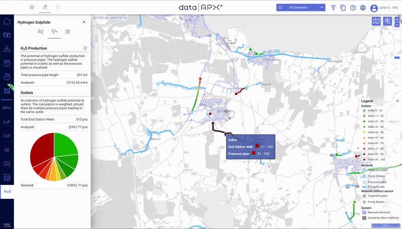 The H2S module of APX is a screening tool, providing an overview of areas where it might be worthwhile to act in regard to e.g. chemicals and sensors. Analysis for each area is possible through in-depth calculation on each section of pressure pipes in the network based on already existing data for minimized investment efforts.